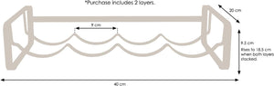 - MEASUREMENTS: Width: 40cm x Depth: 20cm x Height: 9.5cm (Height rises to 18.5cm when both layers stacked. This enables 8 bottles to be stored).